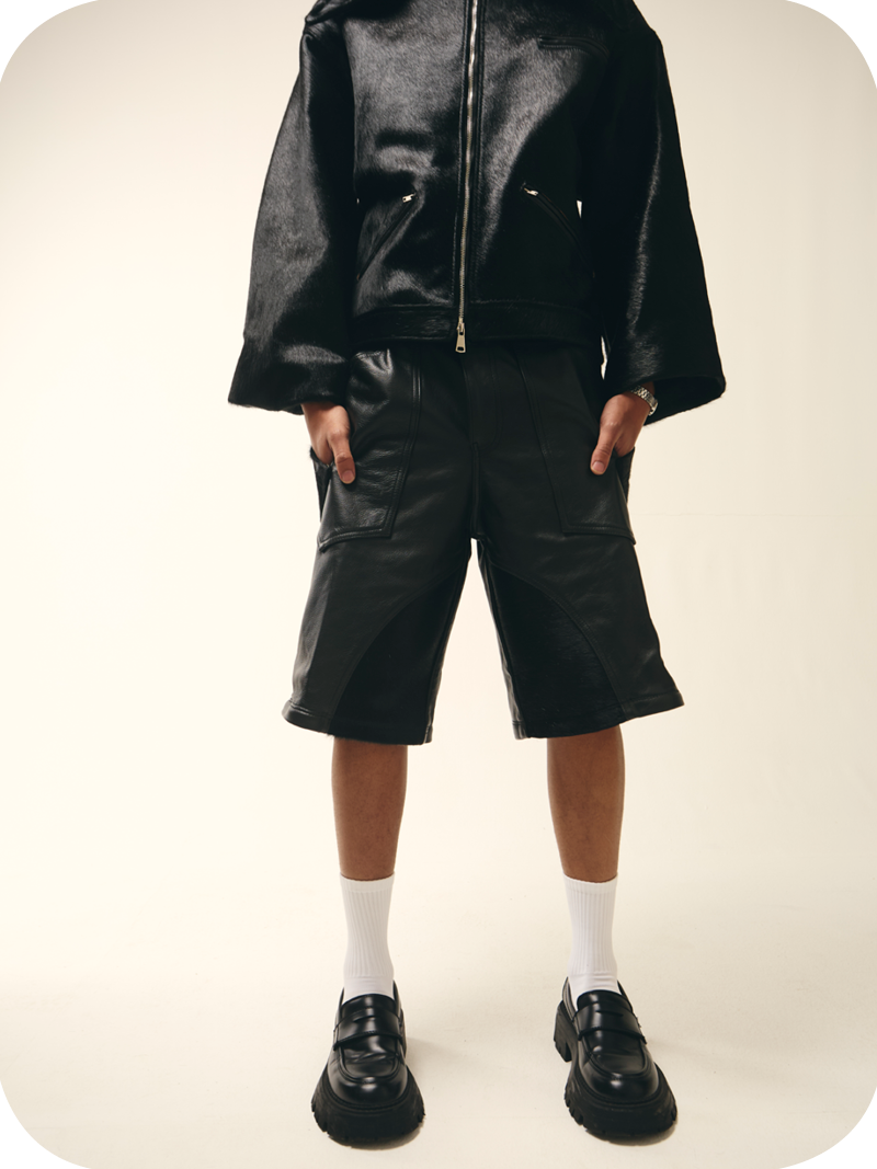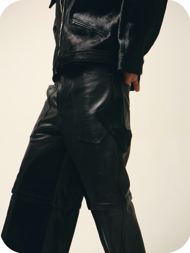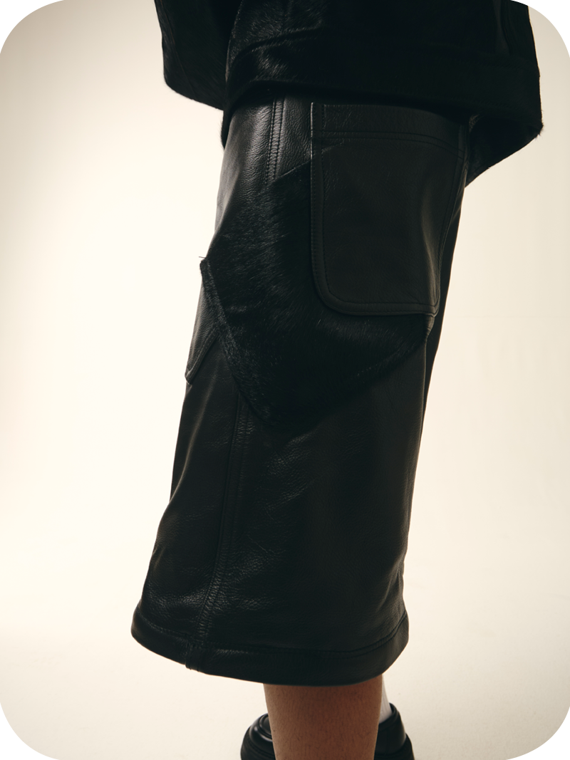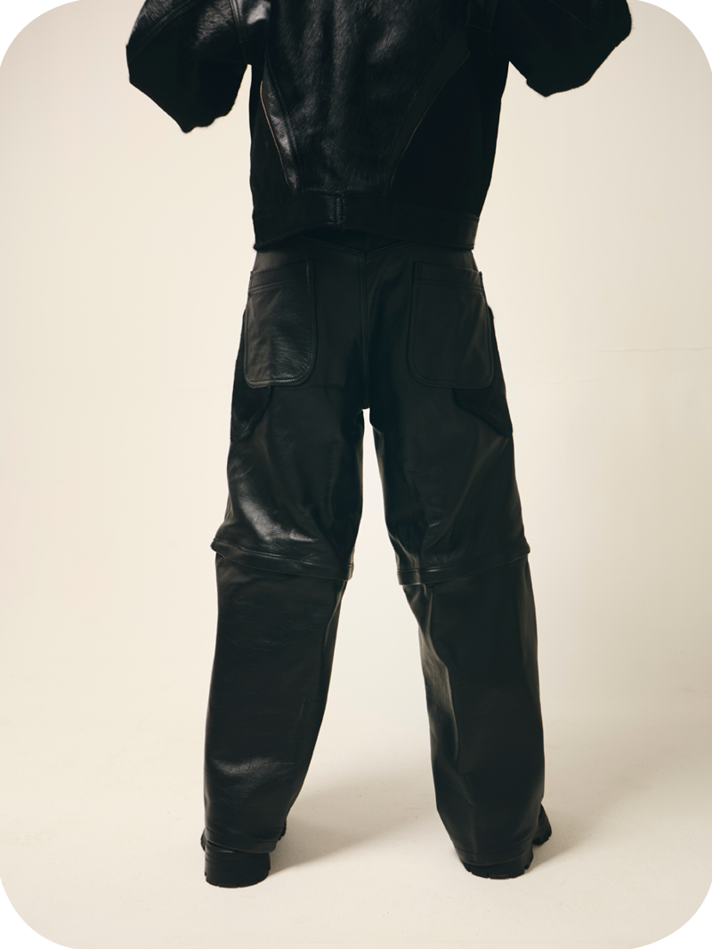 “Black Leather” is a heavyweight black transformable pair of leather cargos mixed fabric with cowhide skin for leg details. They can either be worn as a shorts with multi pockets detail or as a full cargo with seamless zips