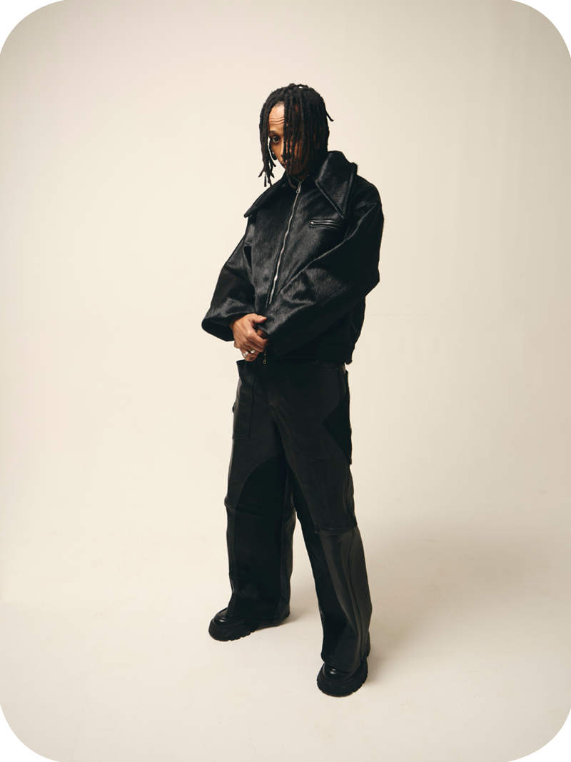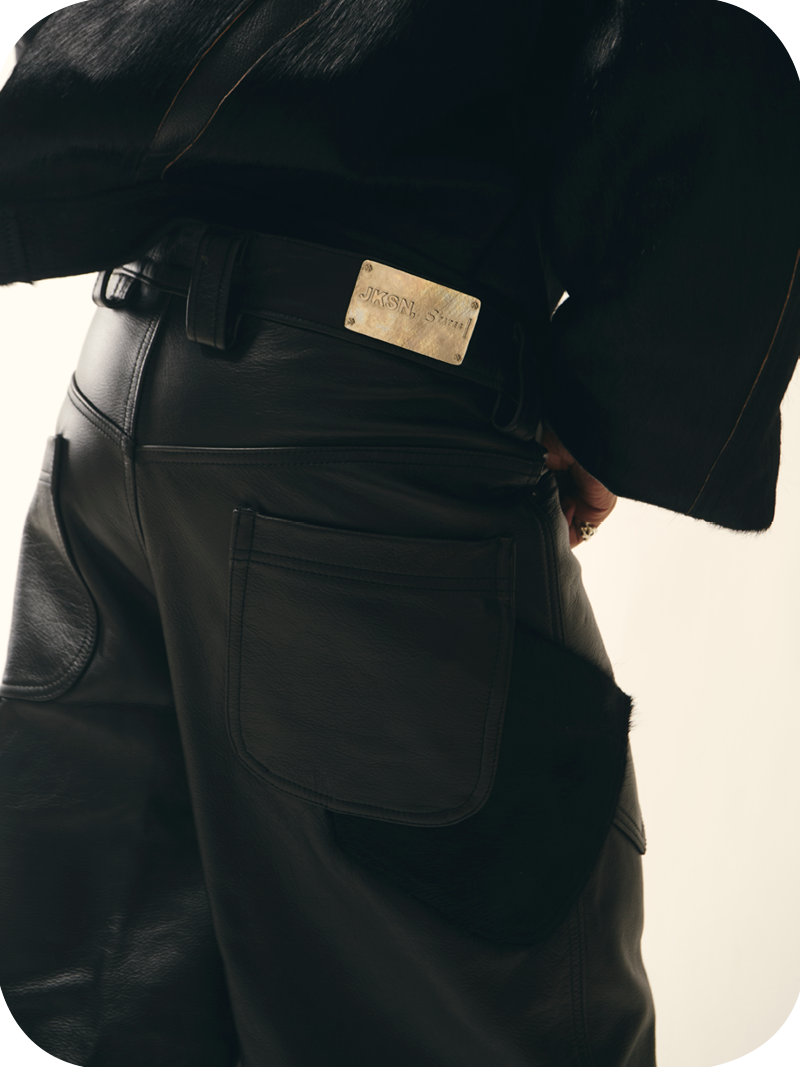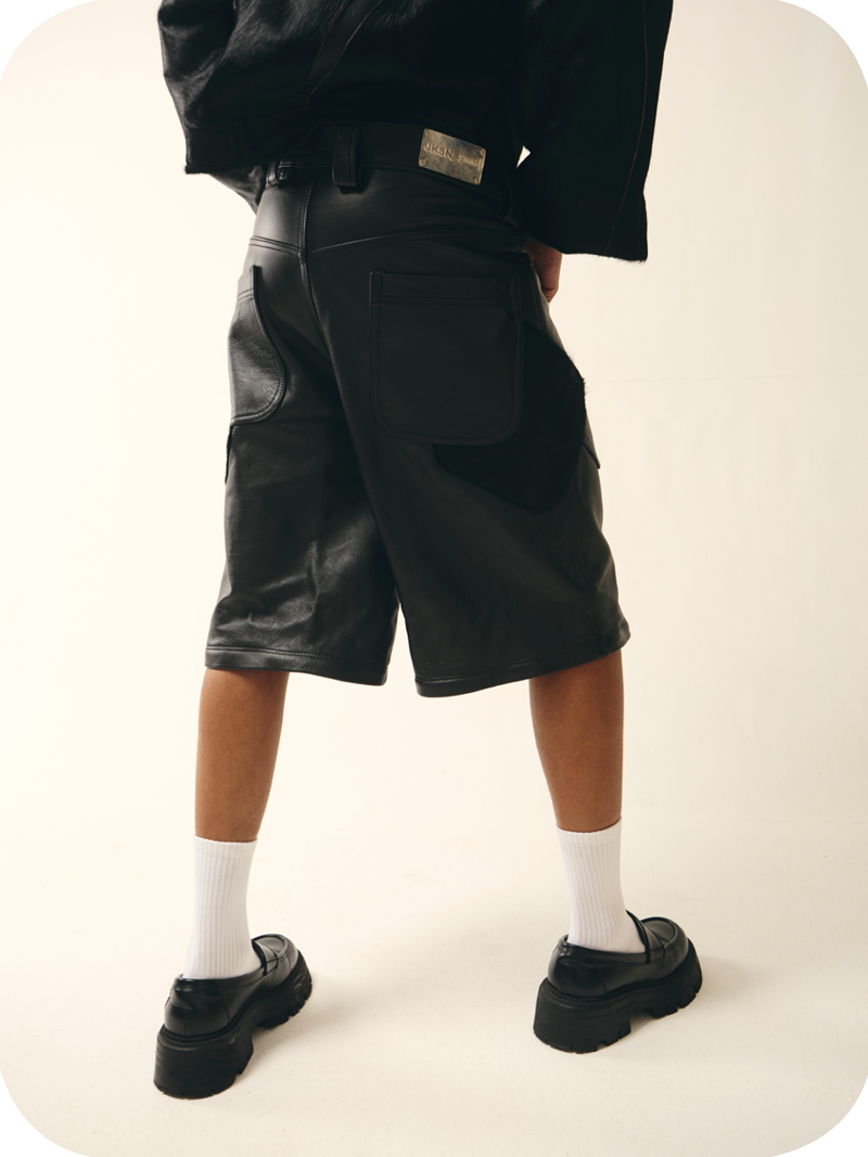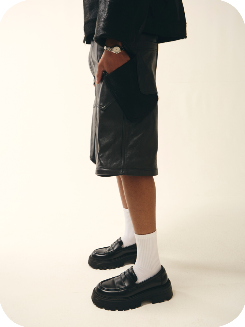 “Black Leather” is a heavyweight black transformable pair of leather cargos mixed fabric with cowhide skin for leg details. They can either be worn as a shorts with multi pockets detail or as a full cargo with seamless zips
